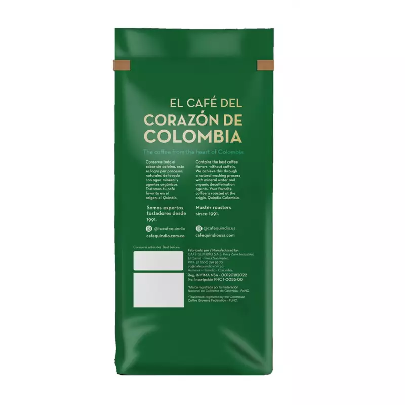 What was born as a dream, is now a reality, one in which over 400 employees work fully committed to offer you the best cup of coffee from local coffee growers roasted and packed at origin. Quindío State, from where our name comes from, is located is the center of Colombia, that´s why we call ourselves the “Coffee from the Heart of Colombia”. This strategic location gives our State the privilege of having flat terrain as well as the majestic Andes Mountains. This difference in altitudes, allows the region to offer different varieties of Arabica coffee, each with its unique characteristics of flavor, notes, body and texture. Decaf is a blend of different varieties (Colombia and Castillo) of coffee harvested at around 3937-5577 feet above sea level (1200-1700 m.a.s.l.), giving it its unique chocolate and plums flavor notes. Its medium roast with its medium-low acidity, offers you a cup of coffee with a medium body, residual plum notes and cocoa and panela fragrance and scent. And the best of all, caffeine-free, so you can drink it any time of the day or night without disturbing your sleeping habits! The Decaffeination process is done through the Ethyl Acetate Sugar Cane Technique. In this process, the solvent used is 100% natural, a by-product of sugar cane. No chemicals are used during this process! By buying this coffee, you are contributing to the well-being of many local and small coffee growers in the well-known “Coffee Triangle” of Colombia, where coffee tradition is still the staple of this magical region.
