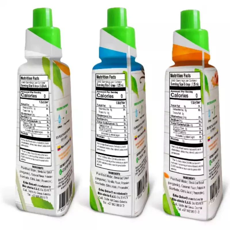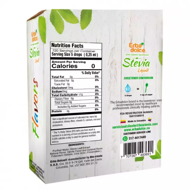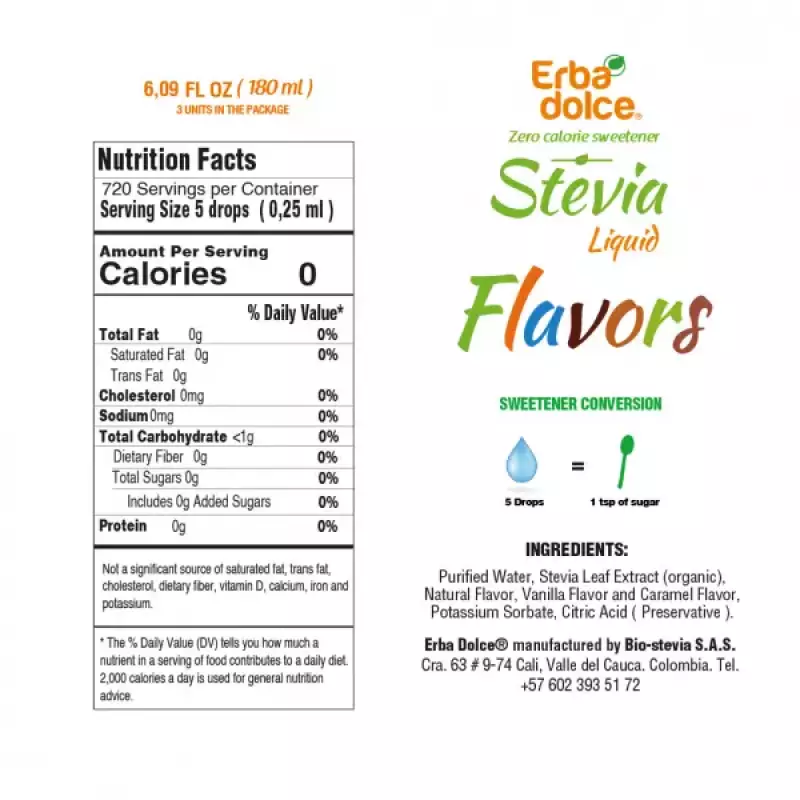 Liquid Stevia sweetener natural flavor, vanilla flavor and caramel flavor. Manufactured by Biosteva S.A.S. under the brand name Erbadolce. Biostevia S.A.S. is a Colombian company with more than 20 years of experience in the manufacture of Stevia sweetener, currently exporting its products to more than 10 countries.