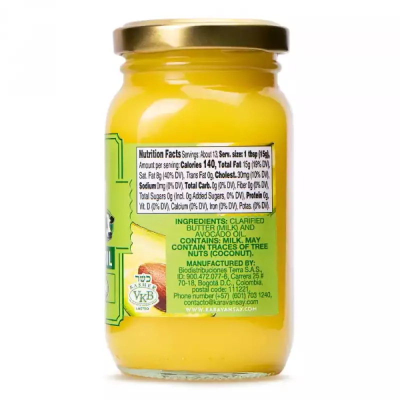 • Clarified butter Ghee with the ideal mix of pure Avocado oil. Long shelf life, does not need to be refrigerated, high smoke point, no salt added, Kosher, ideal to ketogenic and paleo diet, wide uses in cook, 100% natural. Ideal to share with sea food. Certifications: Gluten Free by GFCO GMP by SGS Kosher ISO 9001:2015 by Bureau Veritas