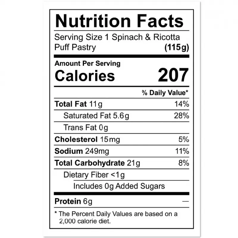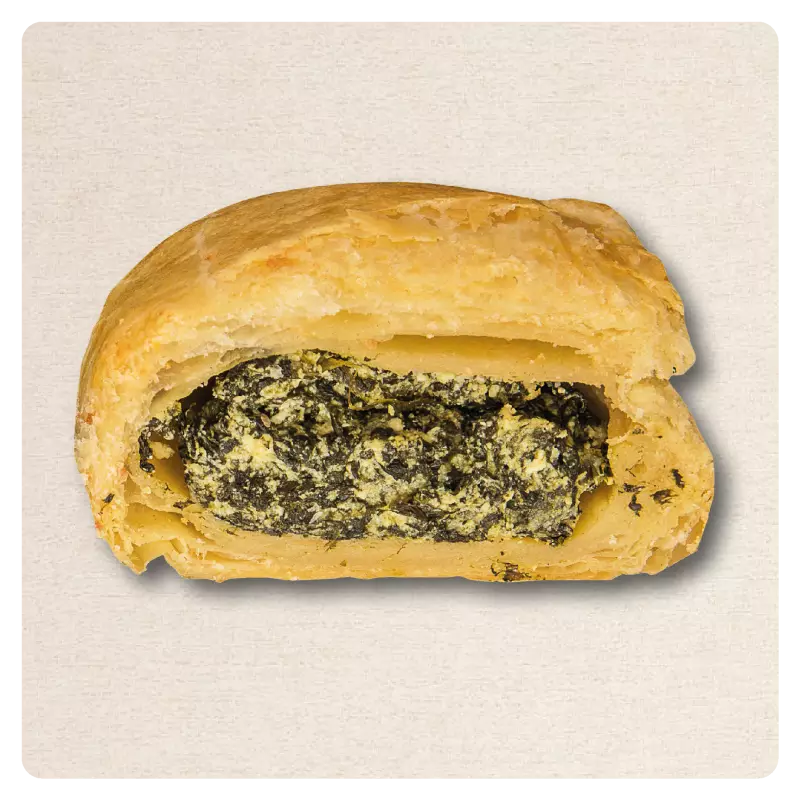 • Our Spinach & Ricotta Puff Pastries combine fresh spinach and creamy ricotta cheese in a light, flaky pastry. Made in a USDA and FDA certified facility, they are free from preservatives and additives—offering a wholesome, vegetarian-friendly option with exceptional flavor.